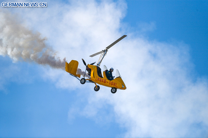 Das Foto zeigt einen Gyrocopter bei einer Vorführung während der 7. China Helicopter Exposition in der nordchinesischen Stadt Tianjin, 18. Oktober 2025. (Xinhua/Zhao Zishuo)