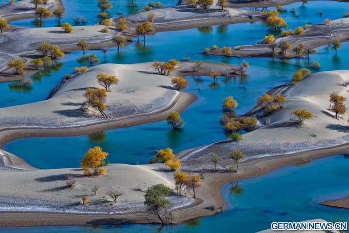 Die Luftaufnahme einer Drohne zeigt die Landschaft mit Euphrat-Pappel-Wäldern an einem See im Kreis Hotan der Präfektur Hotan im Uigurischen Autonomen Gebiet Xinjiang im Nordwesten Chinas, 20. Oktober 2025. (Xinhua/Xin Yuewei)