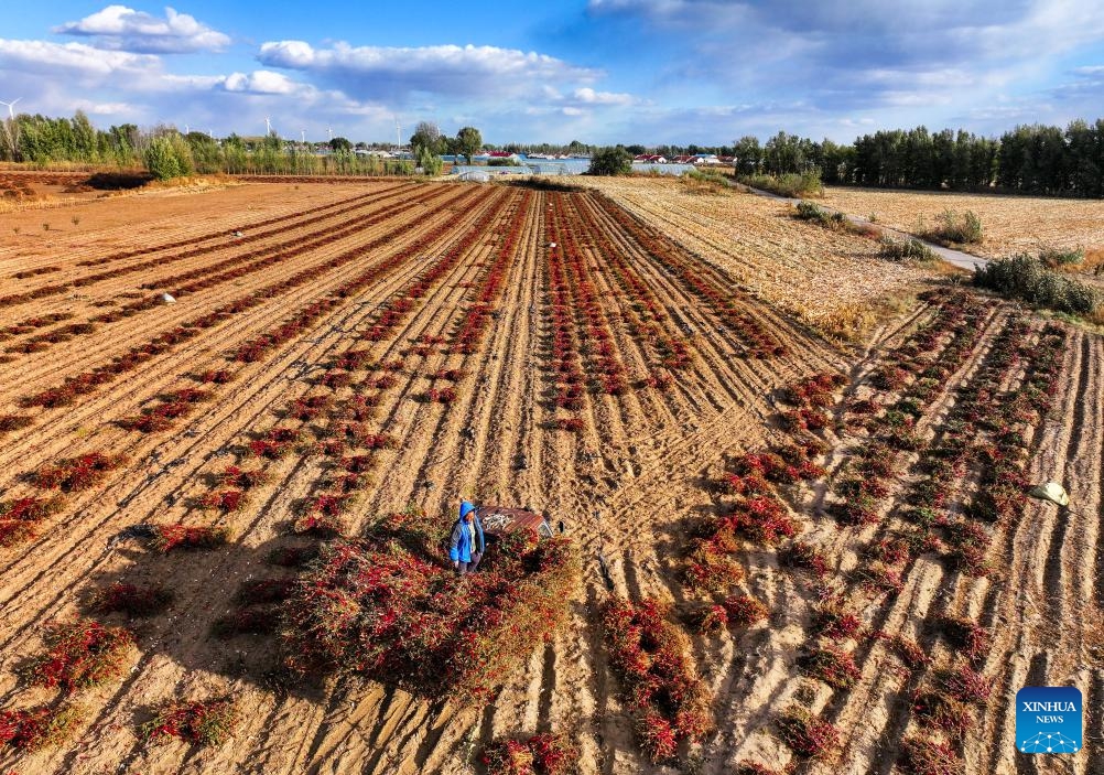 Dorfbewohner ernten Chilischoten auf einem Feld. (19. Oktober 2025, Xinhua)