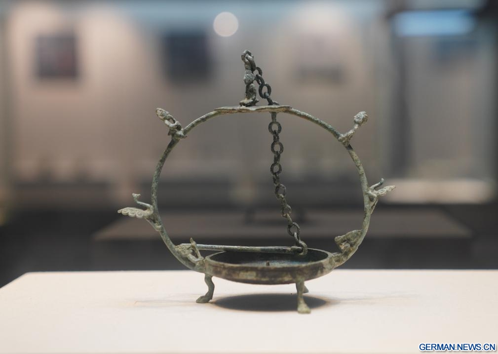 Das am 21. Oktober 2025 aufgenommene Foto zeigt ein Exponat im Han-Kulturmuseum im Kreis Hepu im südchinesischen Autonomen Gebiet Guangxi der Zhuang-Nationalität. Das 1978 gegründete Han-Kulturmuseum des Kreises Hepu konzentriert sich auf die historische und kulturelle Präsentation der maritimen Seidenstraße während der Han-Dynastie (202 v. Chr. – 220 n. Chr.). Das Museum erstreckt sich über eine Fläche von 13.300 Quadratmetern und beherbergt insgesamt 5.208 Stücke und Sets von Kulturrelikten. (Quelle: Xinhua/Zhou Jiayi)