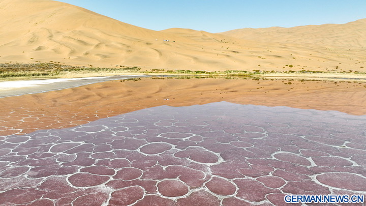 Ein See in der Badain-Jaran-Wüste im Rechten Alxa-Banner des Alxa-Bundes in der Autonomen Region Innere Mongolei, Nordchina. Die Region wurde im Juli 2024 in die UNESCO-Welterbeliste aufgenommen. (Foto: 22. Oktober 2025, Xinhua/Bei He)