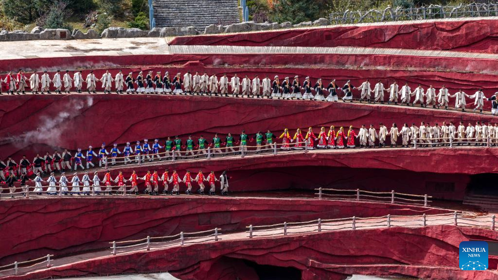 Eine Kulturvorführung in der Yulong-Schneeberg-Landschaftszone. (Foto vom 26. Oktober 2025, Xinhua/Hu Chao)
