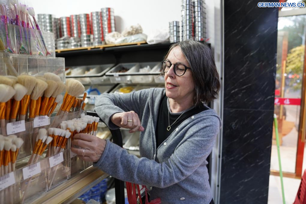 Christiane Toewe wählt in einem Geschäft in der Stadt Jingdezhen in der ostchinesischen Provinz Jiangxi Werkzeuge für die Keramikherstellung aus, 19. Oktober 2025. (Quelle: Xinhua/Zhou Mi)