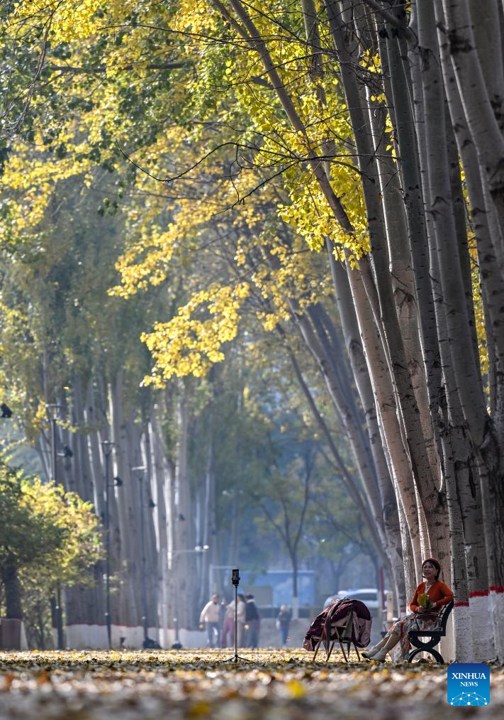 Eine Besucherin bewundert die Herbstlandschaft im Fenghuang-Park in Yinchuan. (Foto vom 28. Oktober 2025, Xinhua/Feng Kaihua)