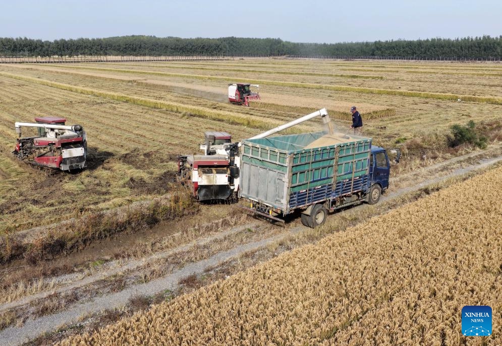Die Reisernte hat in Tangshan in der nordchinesischen Provinz Hebei begonnen und die Bauern nutzen das gute Wetter, um die Ernte voranzutreiben.