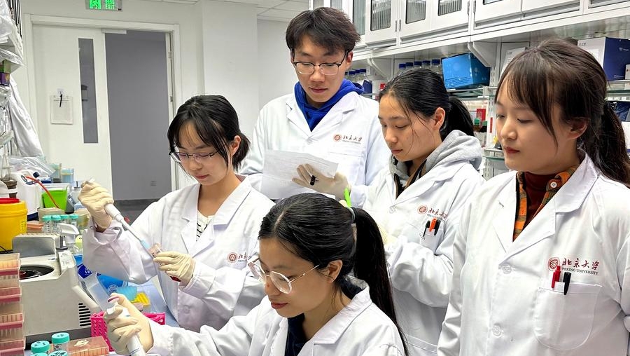 Ein Forschungsteam der Peking-Universität führt am 29. März 2024 in einem Labor der Peking-Universität Untersuchungen zur Tumorkachexie durch. (Foto: Peking-Universität/Handout durch Xinhua)