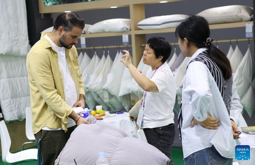 Ein Besucher betrachtet Heimtextilien. (31. Oktober 2025, Xinhua)