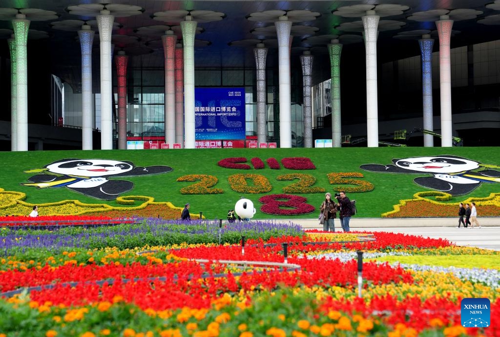 Das Foto zeigt den südlichen Platz des National Exhibition and Convention Center (Shanghai), dem Hauptveranstaltungsort der achten China International Import Expo (CIIE). (29. Oktober 2025, Xinhua)