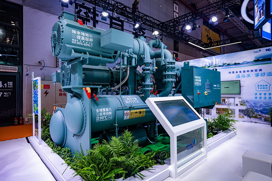 Johnson Controls präsentiert als Weltpremiere die York CYK Hochtemperatur-Zentrifugalwärmepumpe, die eine effiziente Rückgewinnung industrieller Abwärme ermöglicht. (Foto von Zheng Liang/ China.org.cn)