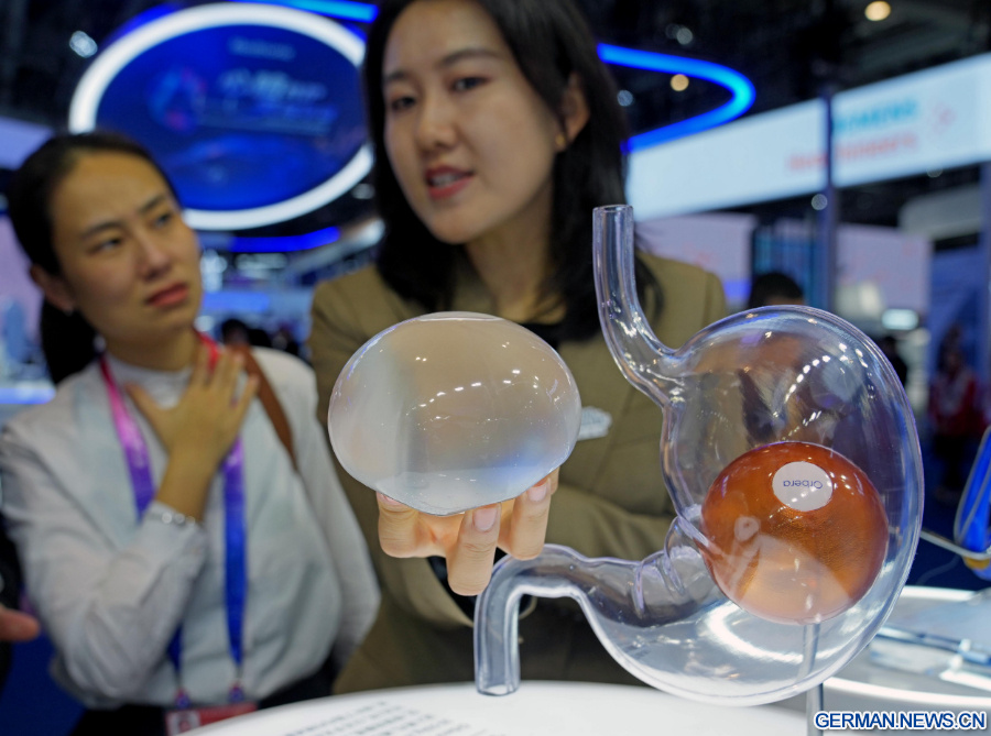 Das Foto zeigt eine Ausstellerin bei der Vorstellung des Orbera365-Magenballonsystems, das Patienten bei der Gewichtsabnahme unterstützt, im Ausstellungsbereich für medizinische Geräte und Gesundheitsprodukte der 8. Internationalen Importmesse Chinas (CIIE) in Shanghai in Ostchina, 6. November 2025. (Xinhua/Liu Ying)