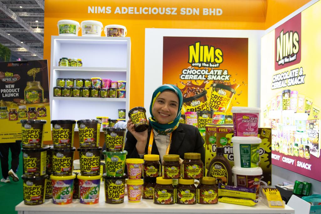 Eine Mitarbeiterin aus Malaysia zeigt ein Schokoladenprodukt im Ausstellungsbereich für Lebensmittel und Agrarprodukte während der achten Internationalen Importmesse Chinas (CIIE) im ostchinesischen Shanghai, 7. November 2025. (Quelle: Xinhua/Tian Weiwei)