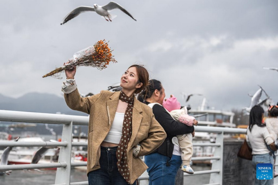 Eine Dame posiert für Fotos mit den Lachmöwen am Haigeng-Staudamm am Dianchi-See. (Foto von Xinhua/Wang Guansen)