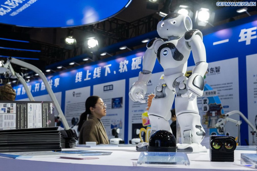 Die „China 5G + Industrial Internet Conference 2025“ fand vom vergangenen Freitag bis Sonntag in Wuhan, der Hauptstadt der zentralchinesischen Provinz Hubei, statt. Das Foto zeigt einen humanoiden Roboter auf der Messe. (Foto: Xinhua/Du Zixuan)