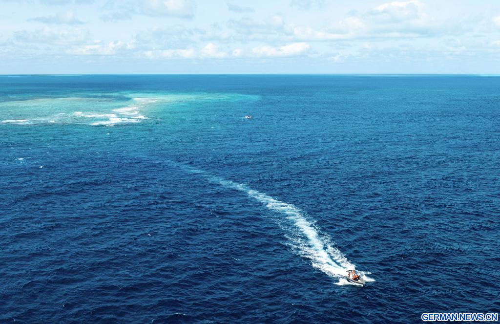 Die Luftaufnahme einer Drohne zeigt die chinesische Küstenwache (CCG) bei der Durchführung von Strafverfolgungspatrouillen in den Hoheitsgewässern von Huangyan Dao und den umliegenden Gebieten, 14. November 2025. (Quelle: Xinhua/Bei He)