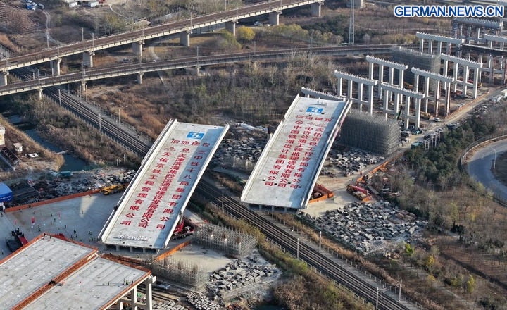 Die Zwillings-Drehbrücken der Xinggang-Autobahn schlossen dort am Mittwoch ihre Rotation ab. Zwei durchgehende Träger mit einem Gewicht von jeweils 14.000 Tonnen drehten sich gleichzeitig um mehr als 60 Grad im Uhrzeigersinn, um eine Eisenbahnlinie zu überqueren.