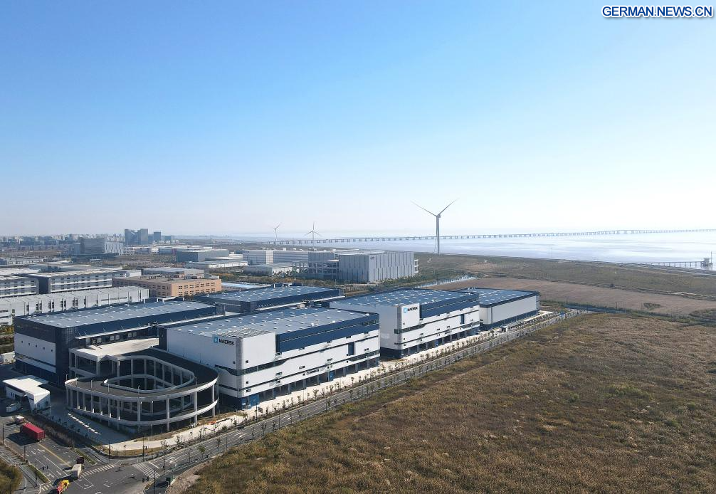 Die Luftaufnahme einer Drohne vom 26. November 2025 zeigt einen Blick auf das Maersk Lin-gang Flagship Logistics Center in Shanghai in Ostchina. (Quelle: Xinhua/Fang Zhe)