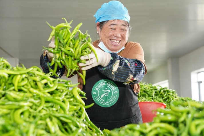 Eine Bäuerin sortiert Chilischoten im Sortierzentrum eines Chili-Industrieparks in der Gemeinde Shanghu der Stadt Gao’an in der ostchinesischen Provinz Jiangxi. 29. Oktober 2025 (Foto: Xinhua/Dai Mingxuan)