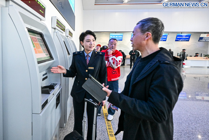 Eine Mitarbeiterin hilft einem Passagier beim Fahrkartenkauf am Südbahnhof von Xingyi in der Provinz Guizhou im Südwesten Chinas, 28. November 2025. (Xinhua/Yang Wenbin)