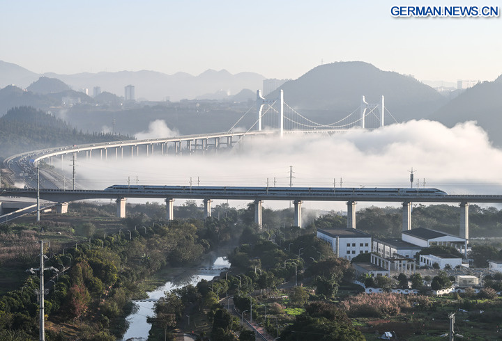 Ein Hochgeschwindigkeitszug fährt über eine Großbrücke der Hochgeschwindigkeitszugstrecke Panzhou-Xingyi in Xingyi in der Provinz Guizhou im Südwesten Chinas, 28. November 2025. (Xinhua/Yang Wenbin)