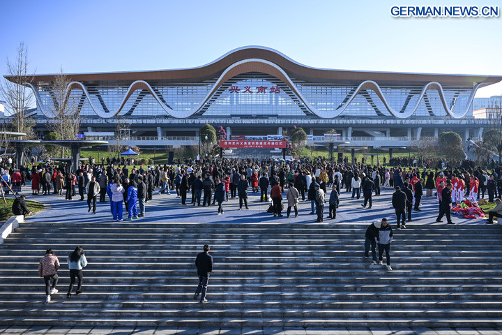 Das Foto zeigt die Einweihungsfeier der Hochgeschwindigkeitszugstrecke Panzhou-Xingyi am Südbahnhof von Xingyi in der Provinz Guizhou im Südwesten Chinas, 28. November 2025. (Xinhua/Yang Wenbin)