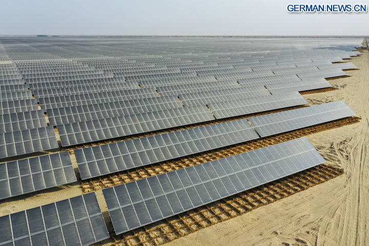 Die Drohnenaufnahme zeigt ein Photovoltaik-Kraftwerksprojekt im Kreis Shaya der Präfektur Aksu im Uigurischen Autonomen Gebiet Xinjiang im Nordwesten Chinas, 13. April 2025. (Xinhua/Ding Lei)