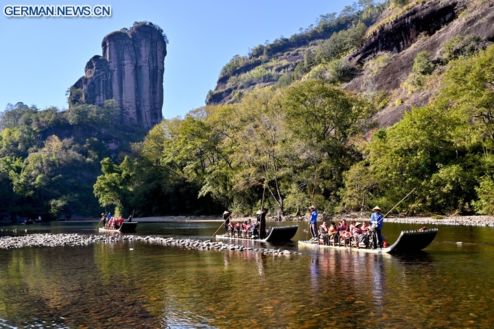 Touristen genießen die Landschaft des Jiuqu-Flusses im Wuyishan-Nationalpark in der Provinz Fujian im Südosten Chinas, 30. November 2025. (Xinhua/Jiang Kehong)