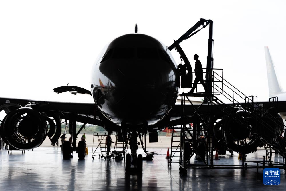 Im „One-Stop“-Hangar in Haikou wird die Instandhaltung an einem Flugzeug durchgeführt. (Foto vom 9. Dezember 2025, Xinhua/Jin Liwang).