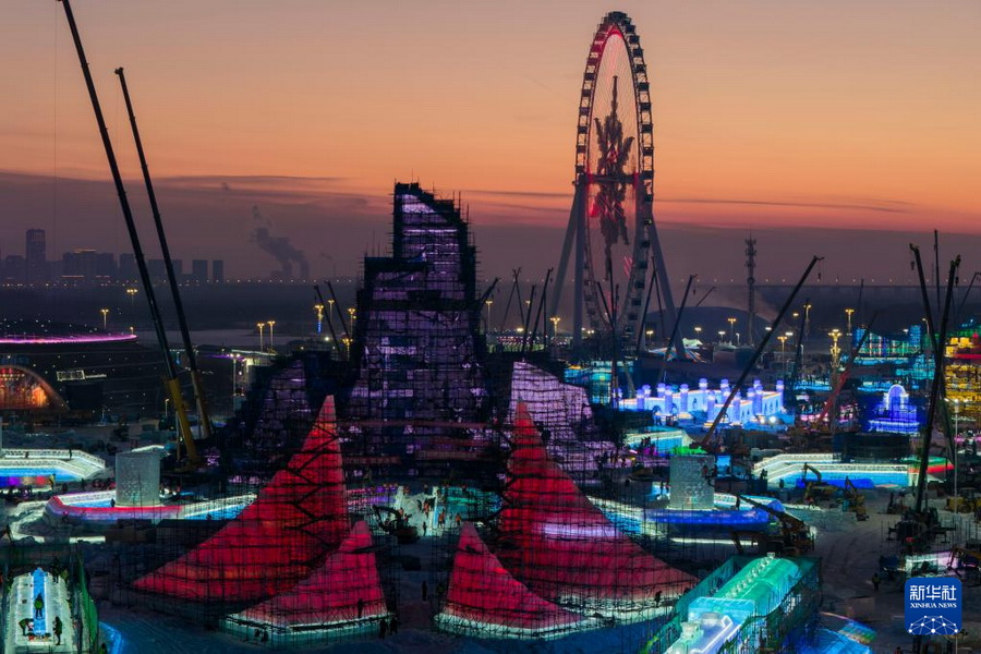Der Rohbau des Hauptturms der bevorstehenden 27. Eis- und Schneewelt in Harbin in der nordostchinesischen Provinz Heilongjiang ist am Mittwoch fertiggestellt worden. An der sogenannten „Träume erleuchtenden Eislaterne“ werden derzeit die Fassade poliert und die Beleuchtungsanlagen eingestellt. Für den Turm, der die höchste und größte einzelne Eisstruktur im diesjährigen Vergnügungspark ist, wurden insgesamt 39.000 Kubikmeter Eis verwendet.