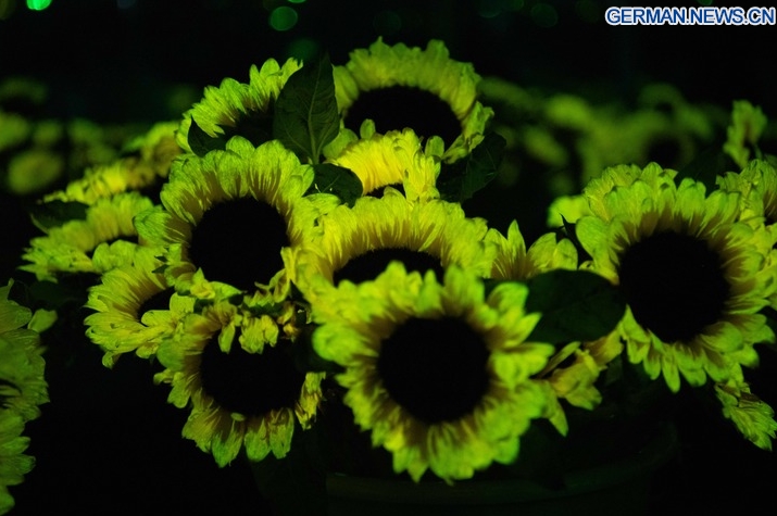 Das Foto zeigt selbstleuchtende Sonnenblumen, gezüchtet von Magicpen Bio in Hefei in der Provinz Anhui in Ostchina. (Foto vom 3. Dezember 2025, Xinhua/Zhang Duan)