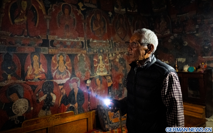 Rigzin Wangzhab überprüft die Piyang-Grotten auf Wassereintritt oder Einsturzgefahr im Kreis Zanda der Präfektur Ngari im Autonomen Gebiet Xizang im Südwesten Chinas, 24. Juni 2025. (Xinhua/Tenzin Nyida)