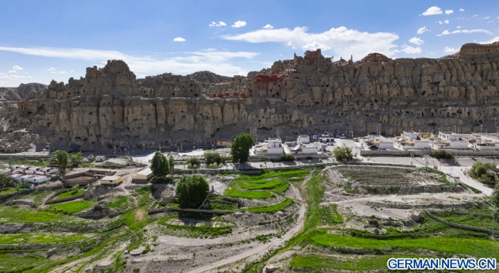 Die Luftaufnahme einer Drohne zeigt die Piyang-Grotten und ein Dorf unterhalb im Kreis Zanda der Präfektur Ngari im Autonomen Gebiet Xizang im Südwesten Chinas, 24. Juni 2025. (Xinhua/Tenzin Nyida)