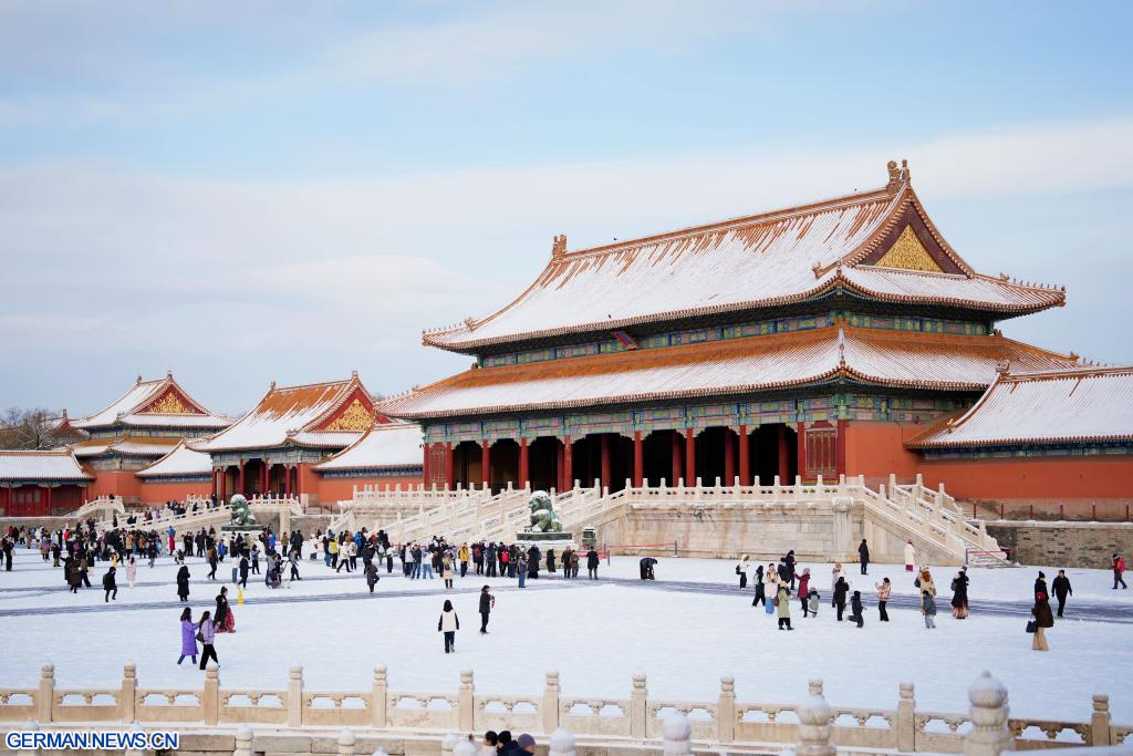 Touristen besuchen das Palastmuseum nach Schneefall in der chinesischen Hauptstadt Beijing, 13. Dezember 2025. (Quelle: Xinhua/Ma Xiaodong)