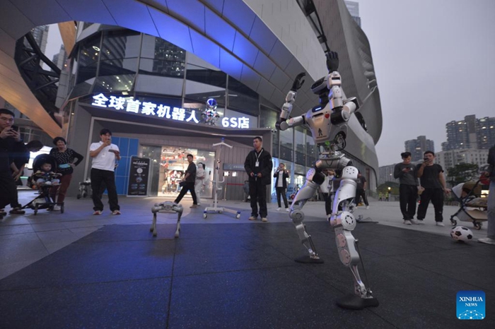 Ein humanoider Roboter tanzt vor einem Roboter-Geschäft in Shenzhen. (28. Oktober 2025, Xinhua)