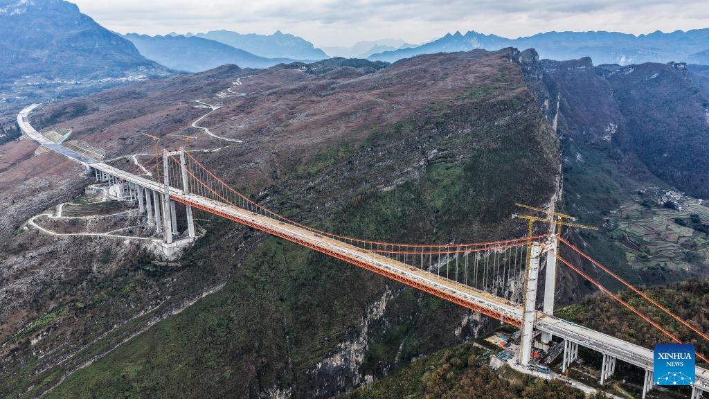 Die Luftaufnahme zeigt die Tianmen-Großbrücke im Bau in der südwestchinesischen Provinz Guizhou. Der Bau des Hauptteils der Brücke auf der Autobahn Anshun-Panzhou wurde kürzlich abgeschlossen. Die Brücke ist 1.553 Meter lang und hat eine Höhe von etwa 560 Metern vom Brückendeck bis zur Oberfläche. (6. Januar 2026, Xinhua)