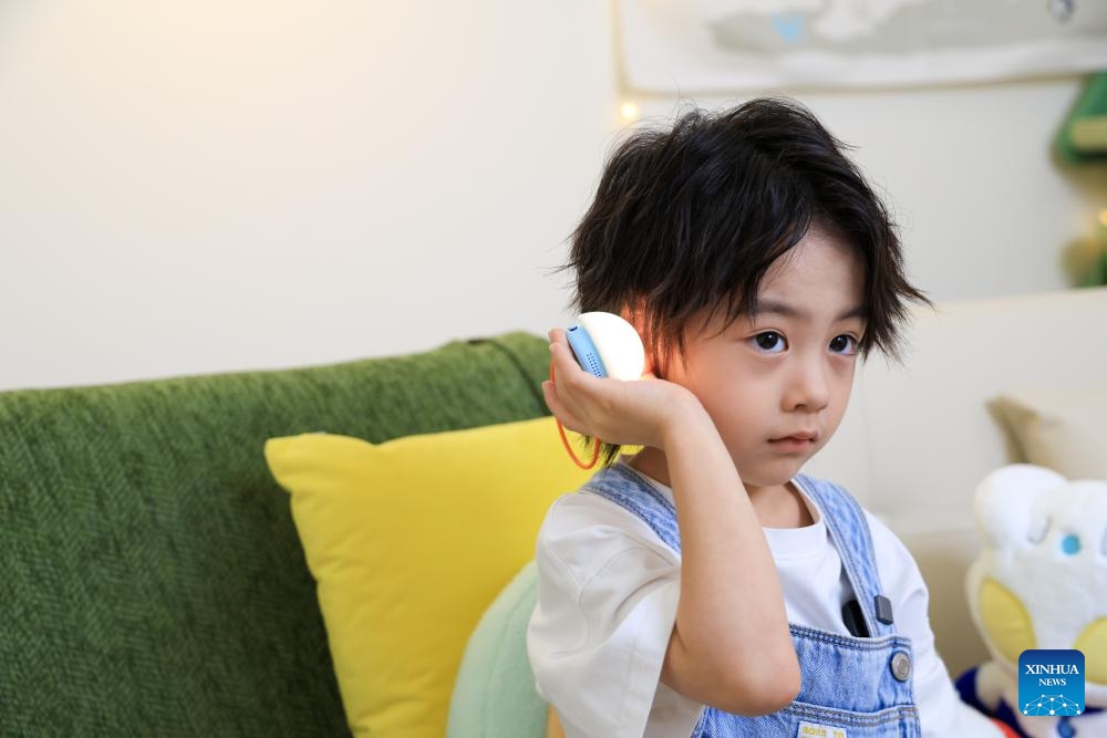 Ein Kind interagiert mit einem KI-Spielzeug der Marke Haivivi in Shenzhen. (31. Oktober 2025, Xinhua)