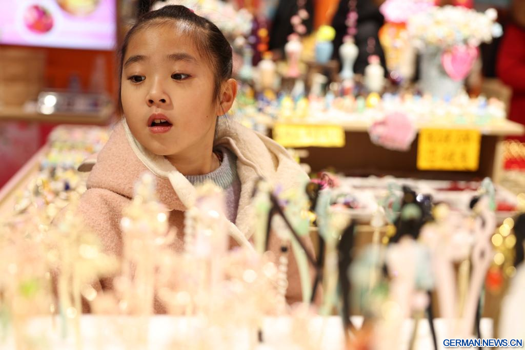 Ein Mädchen wählt Accessoires in einem Geschäft im Bezirk Qilihe in Lanzhou in der nordwestchinesischen Provinz Gansu aus, 6. Januar 2026. (Quelle: Xinhua/Chen Bin)