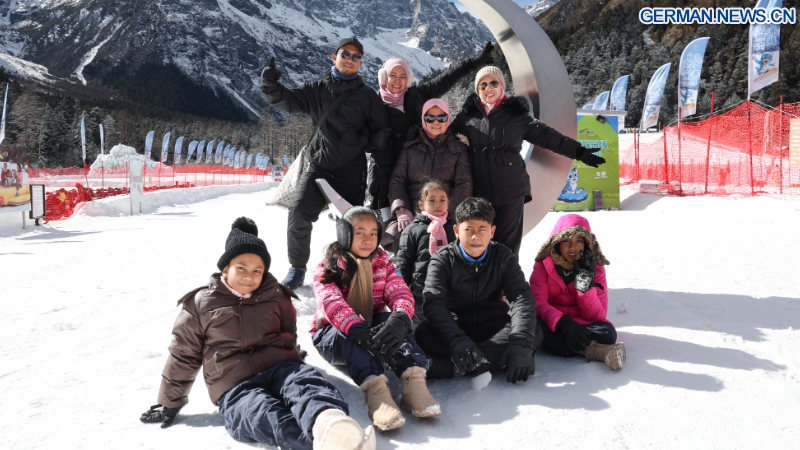 Touristen aus Malaysia haben Spaß in einem Skigebiet im Kreis Lixian in der Provinz Sichuan im Südwesten Chinas, 5. Januar 2026. (Xinhua/Jiang Hongjing)