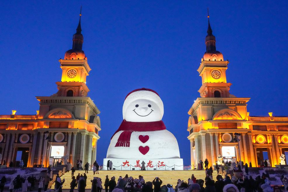 Touristen fotografieren den berühmten riesigen Schneemann im Qunli-Musikpark in Harbin in der nordostchinesischen Provinz Heilongjiang, 10. Januar 2026. (Quelle: Xinhua/Wang Jianwei)