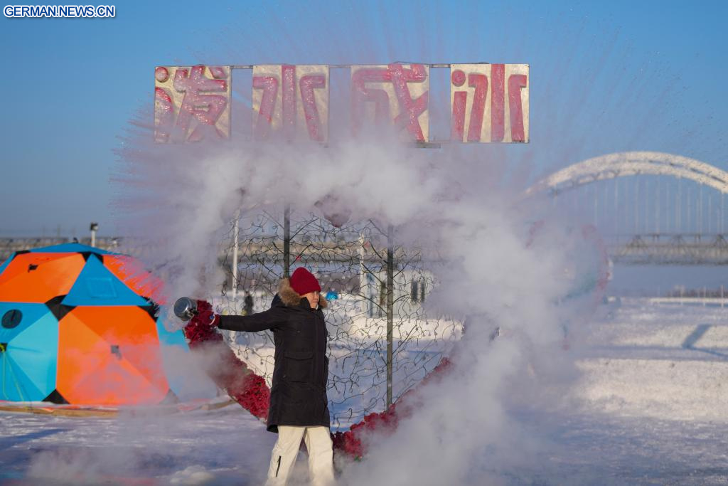 Eine Touristin spielt einen „Wasser zu Eis“-Stunt, indem sie Wasser in die kalte Luft spritzt, auf der gefrorenen Oberfläche des Songhua-Flusses in Harbin in der nordostchinesischen Provinz Heilongjiang, 10. Januar 2026. (Quelle: Xinhua/Wang Jianwei)