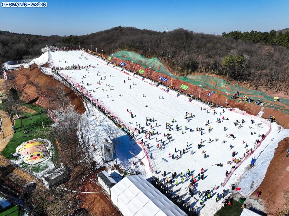 Menschen haben Spaß beim Skifahren im Skigebiet im Ostchinas Jiangsu