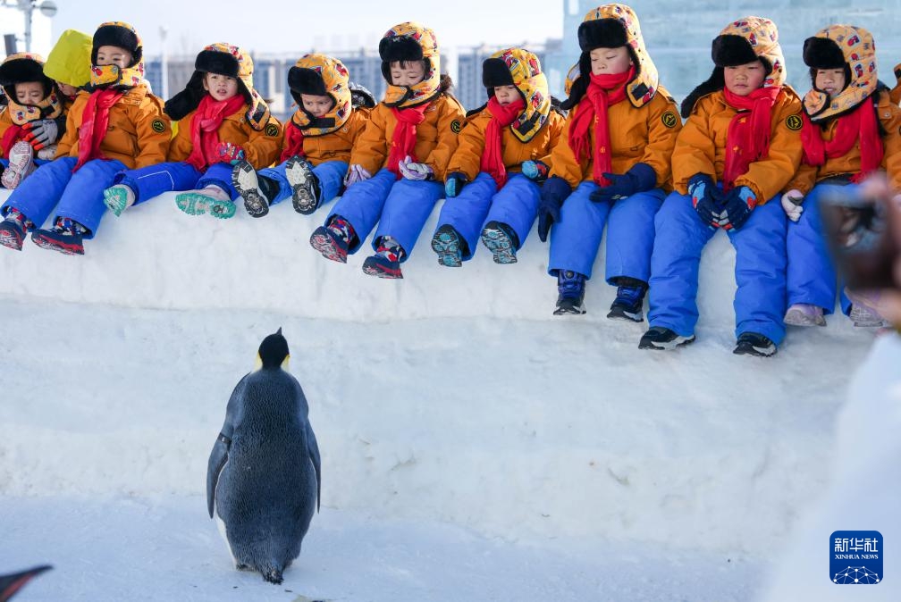 Kinder beobachten Pinguine in der „Neuen Eis- und Schneewelt“ in Changchun in der nordostchinesischen Provinz Jilin. (14. Januar 2025, Xinhua)
