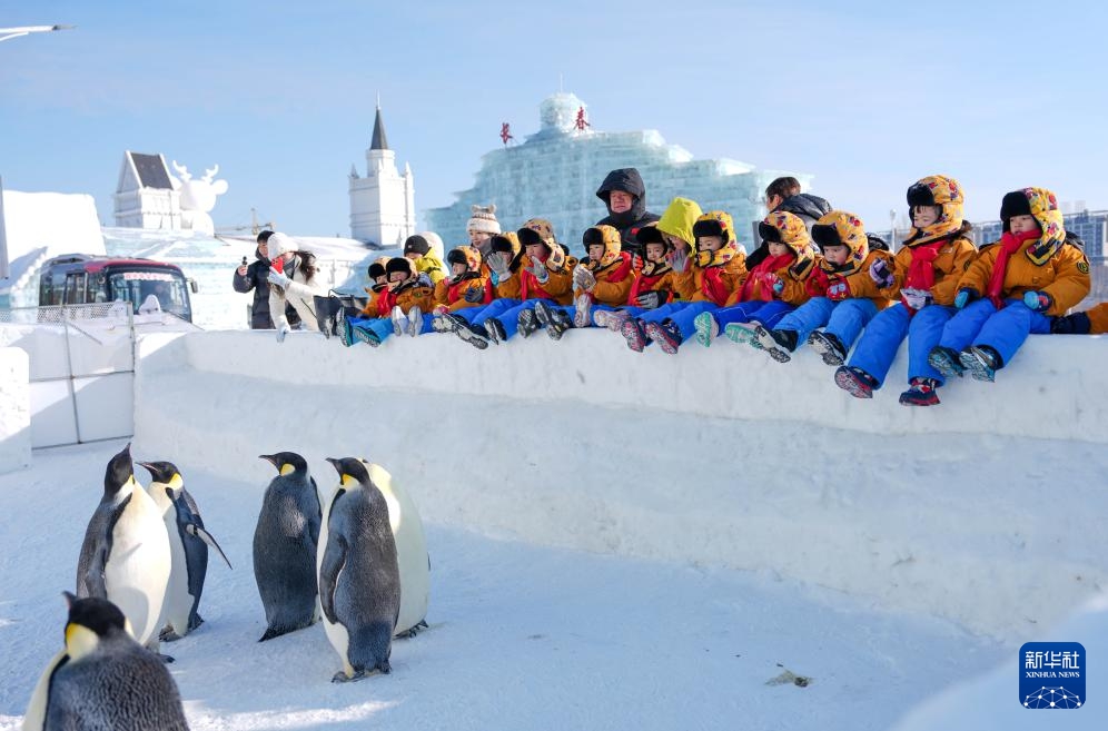 Kinder beobachten Pinguine in der „Neuen Eis- und Schneewelt“ in Changchun. (14. Januar 2025, Xinhua)