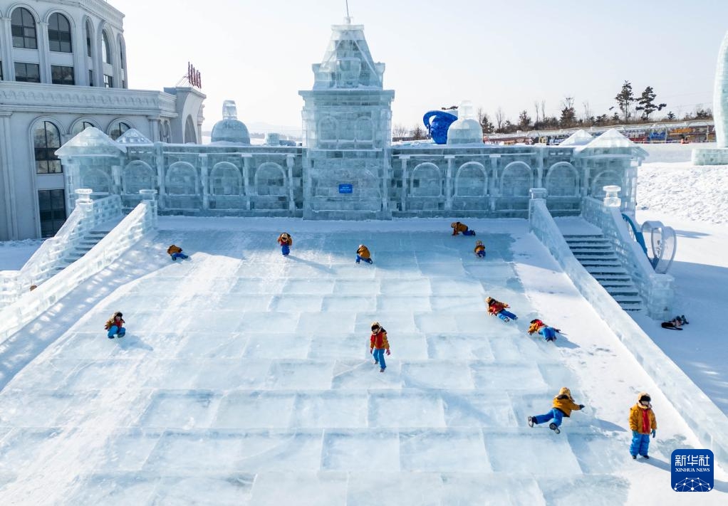 Kinder aus Guangxi genießen das Eisrutschen in der „Neuen Eis- und Schneewelt“ in Changchun. (14. Januar 2025, Xinhua)