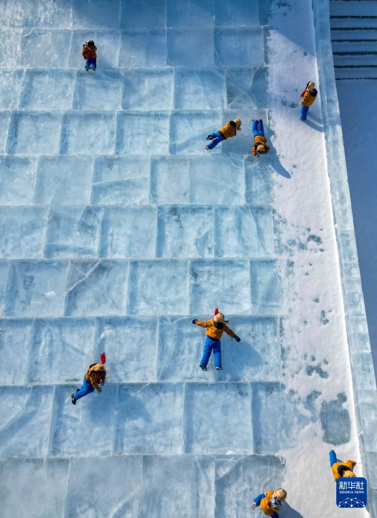 Kinder aus Guangxi genießen das Eisrutschen in der „Neuen Eis- und Schneewelt“ in Changchun. (14. Januar 2025, Xinhua)