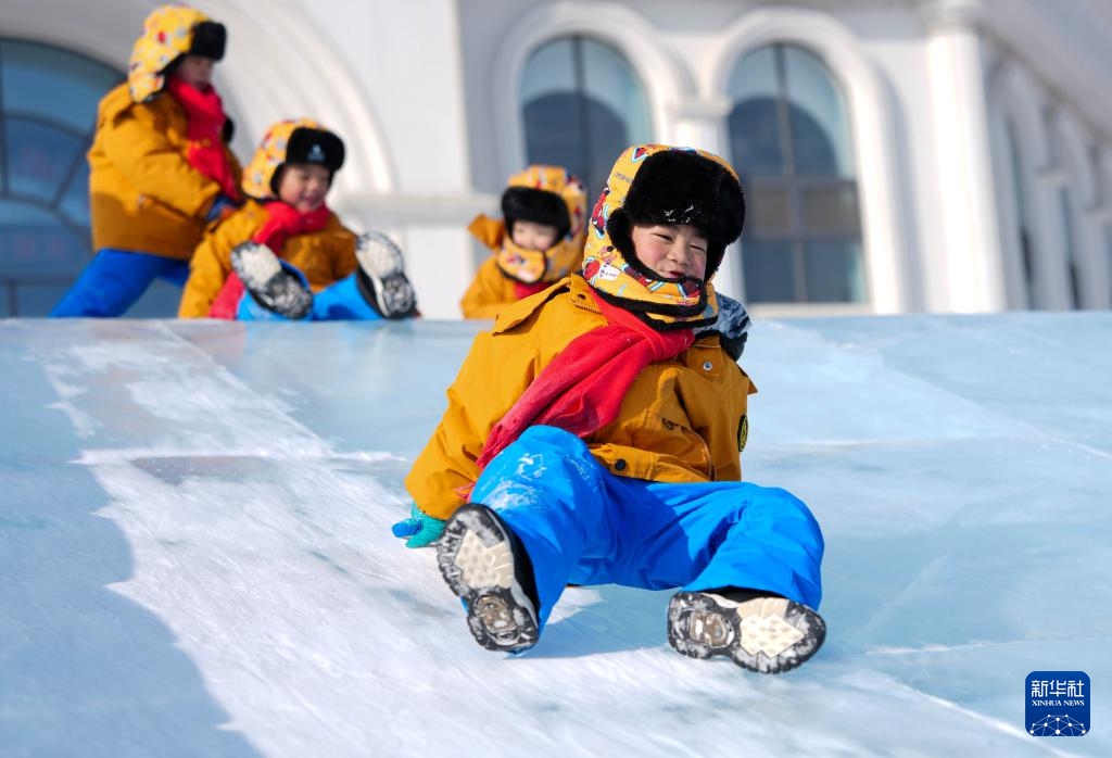 Kinder aus Guangxi genießen das Eisrutschen in der „Neuen Eis- und Schneewelt“ in Changchun. (14. Januar 2025, Xinhua)