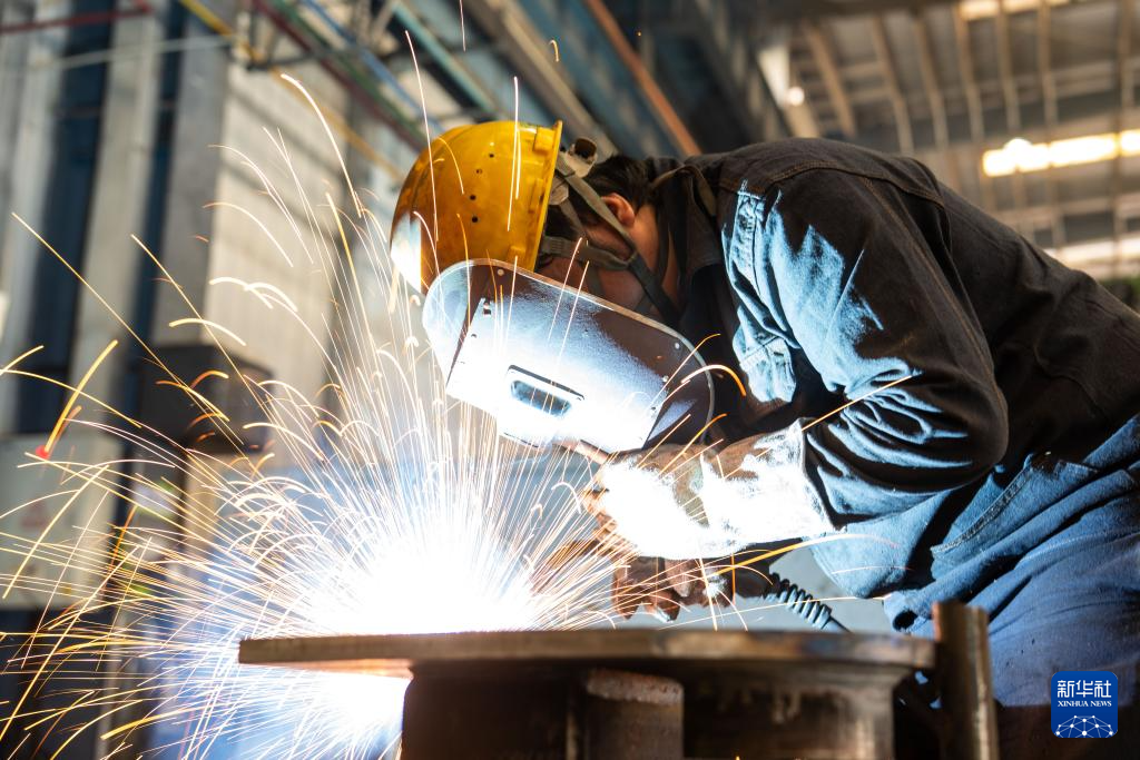 Ein Mitarbeiter der Hunan Teli Hydraulik Co., Ltd. im Hochtechnologiepark von Changde in der Provinz Hunan ist mit der Produktion von extralangen Hydraulikzylindern beschäftigt. (Foto vom 14. Januar 2026, Chen Sihan/Xinhua)