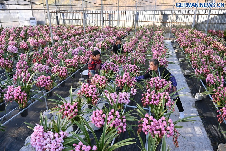 In einem Gewächshaus für Cymbidium-Hybridorchideen in der Gemeinde Puyuan im Kreis Zhouning in der Provinz Fujian arbeiten Angestellte. (Foto: Xinhua/Jiang Kehong)