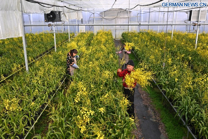 Angestellte arbeiten in einem Gewächshaus in der Gemeinde Puyuan im Kreis Zhouning in der Provinz Fujian im Südosten Chinas. (Foto: Xinhua/Jiang Kehong)