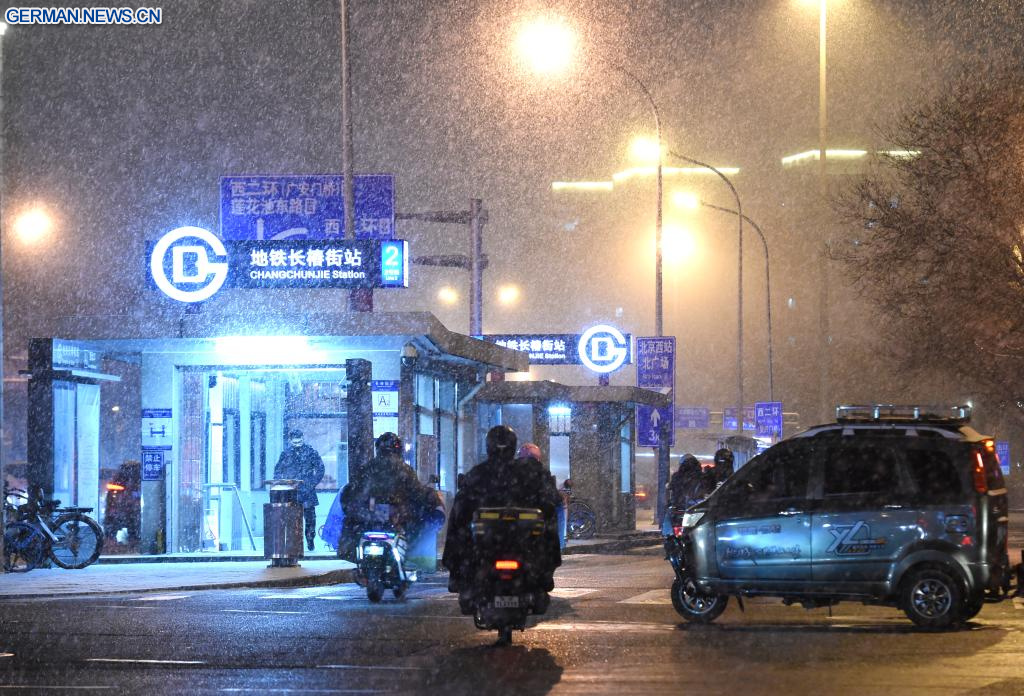 Bürger bahnen sich einen Weg durch den Schneefall in Chinas Hauptstadt Beijing, 17. Januar 2026. Am Freitag wurde Beijing vom Schneefall betroffen. (Quelle: Xinhua/Luo Xiaoguang)