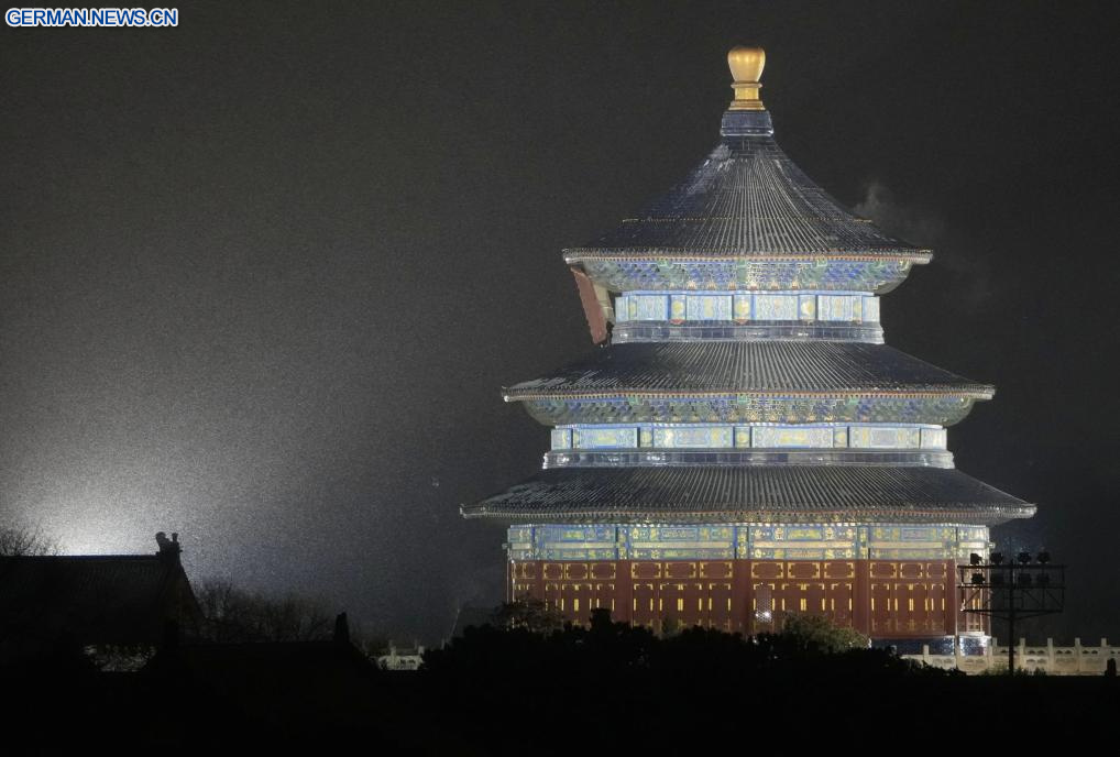 Das am 17. Januar 2026 aufgenommene Foto zeigt den Tiantan-Park (Himmelstempel) im Schneefall in Chinas Hauptstadt Beijing. Am Freitag wurde Beijing vom Schneefall betroffen. (Quelle: Xinhua/Ju Huanzong)